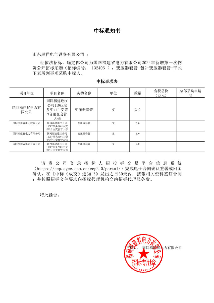 • 2024.12.18 變壓器套管中標(biāo)通知書