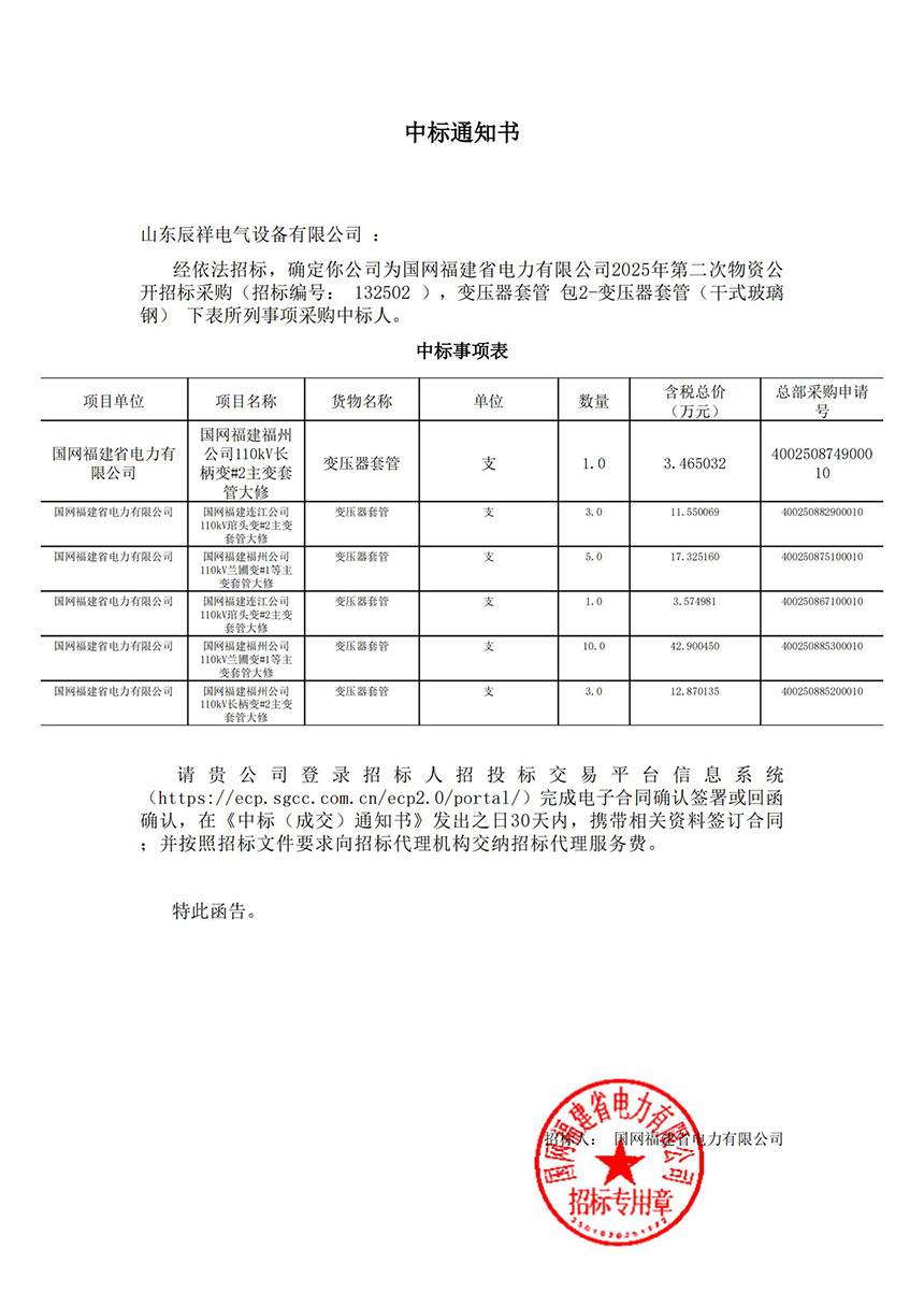 110kV變壓器套管(干式玻璃鋼)中標(biāo)通知書